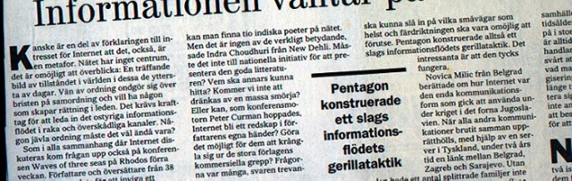 Internet konstruerades av USA:s militär för att fungera i krig. Därför fick det inte finnas en centraldator; inga strategiska broar eller motorvägar att slå ut. Informationen ska kunna slå in på vilka småvägar som helst och färdriktningen ska vara omöjlig att förutse. Pentagon konstruerade alltså ett slags informationsflödets gerillataktik. Det intressanta är att den tycks fungera.
