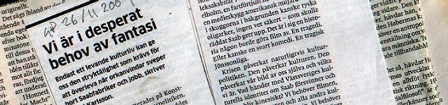 I måndags kväll debatterades på Konsthallen finanskrisen och kulturpolitiken. En timma innan diskussionen inleddes skickades från Hotell Elite Plaza – vilket ingen av oss som satt på Konsthallen då visste – det pressmeddelande som sannolikt beseglar Saabs öde. Tydligare kan knappast krisens konsekvenser, inte bara för kulturlivet utan för hela samhällslivet, illustreras.