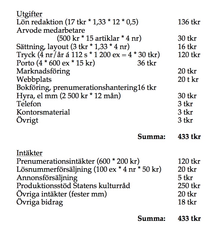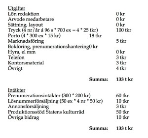Detta är följaktligen en liten men ekonomiskt välskött tidskrift. Parametrarna är få: Antalet prenumeranter får balanseras mot produktionskostnader (dvs i detta fall huvudsakligen tryckkostnader; antal sidor och/eller fyrfärg t ex). Kulturrådets bidrag till denna tänkta tidskrift är alltså knappt 40% av omsättningen. Det är, tror jag, ingen otypisk situation.